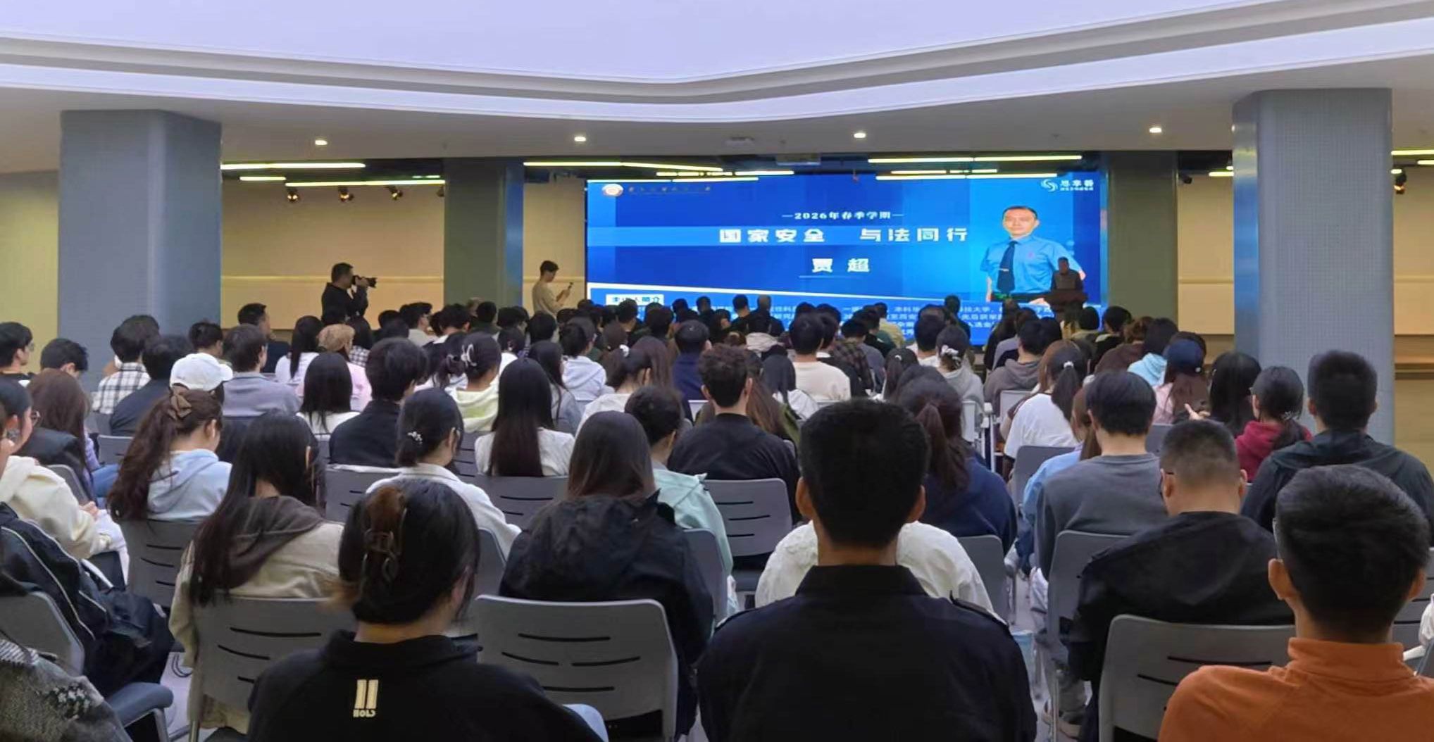 座谈会后,西安市检察院重大犯罪检察部检察官贾超在草堂校区科创中心为辅导员、学生代表和国家安全教育中心教师等200余人开展了“国家安全,与法同行”的主题报告。通过对西安市检察院近年来办理的涉国安案件的剖析,让师生认识到国家安全与每个人的学习工作生活息息相关,进一步提升师生辨别风险的能力。